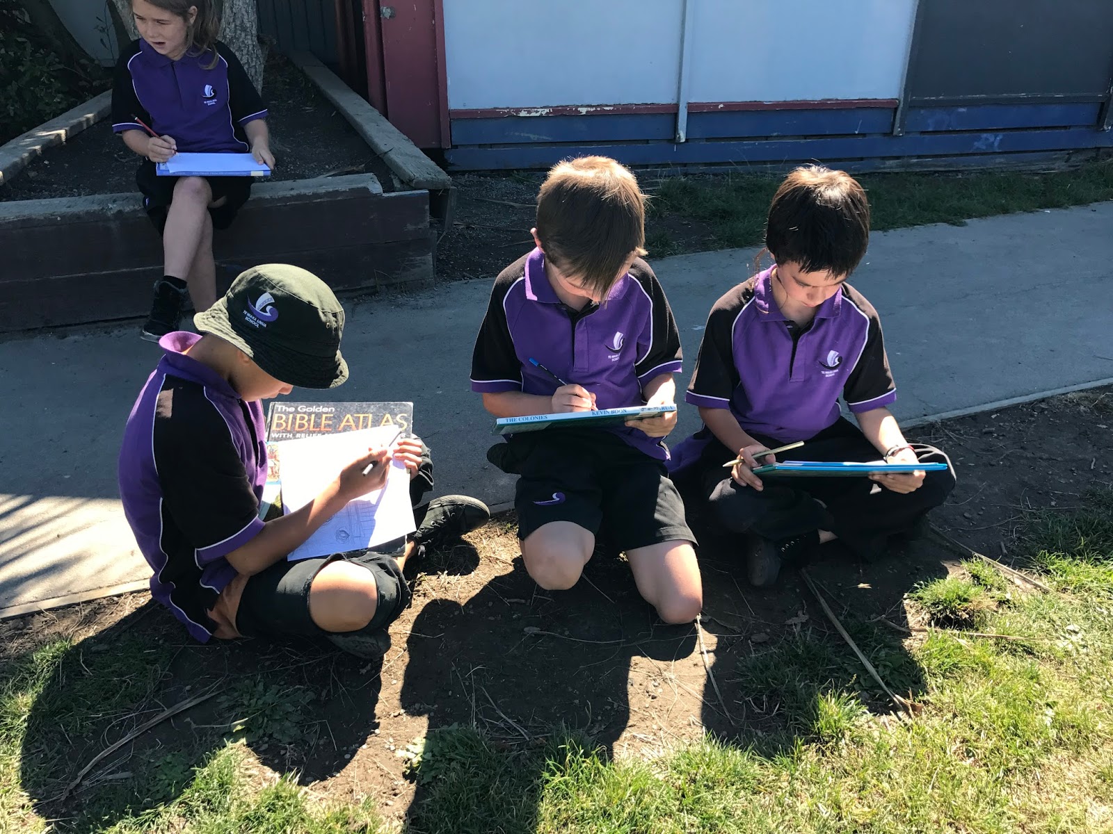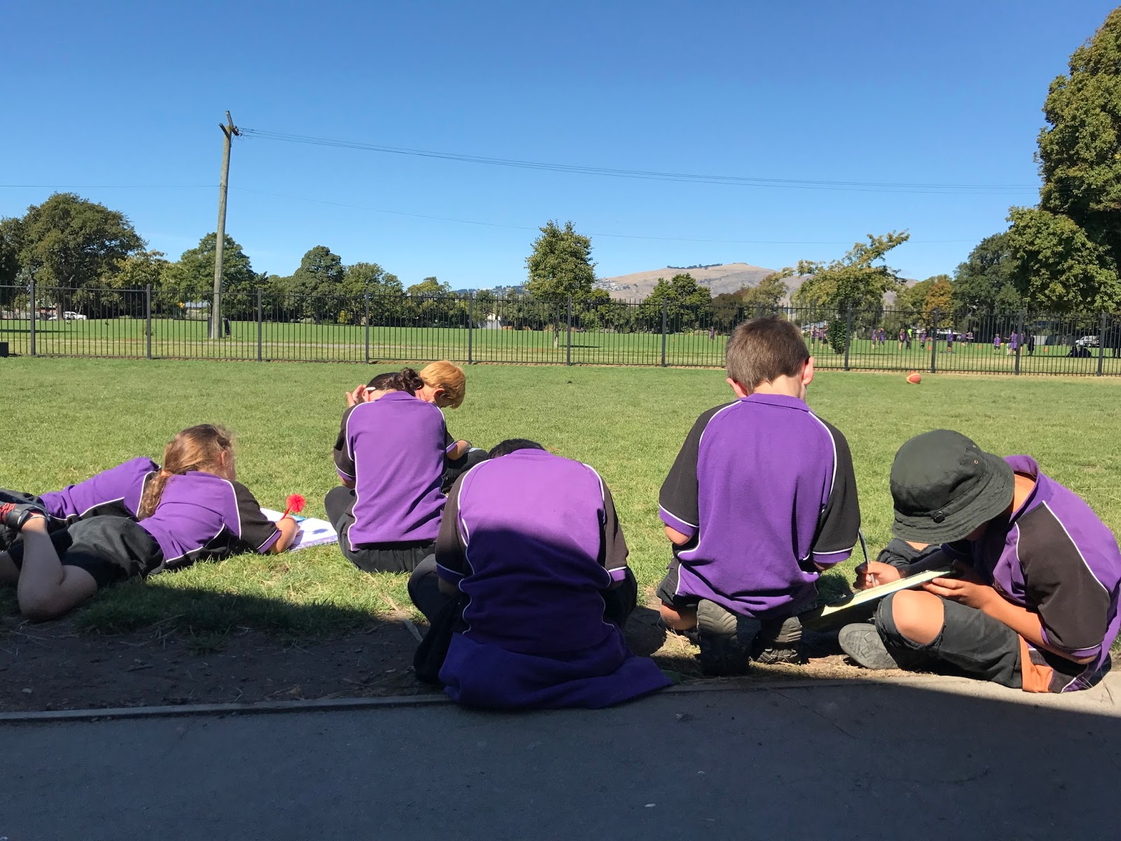 Every afternoon the children break into 4 groups for kaupapa. Today, Kakariki learnt about observational drawing and sketching landscapes. We went outside and sketched the view outside the classroom window of Woolston Park and the Port Hills. We will turn these sketches into a Pepeha (Mini mihi) and display these to show where we live and go to school. Here are some pictures of kakariki enjoying the sun and sketching today.